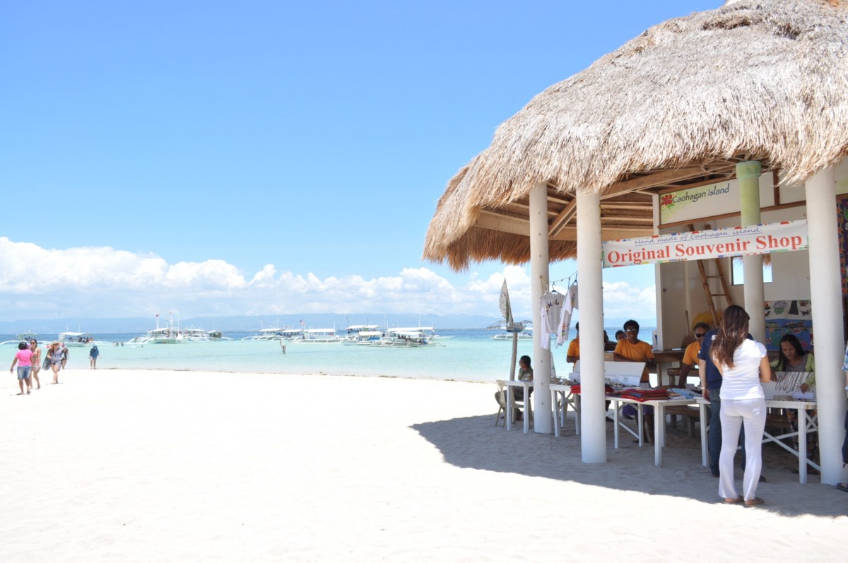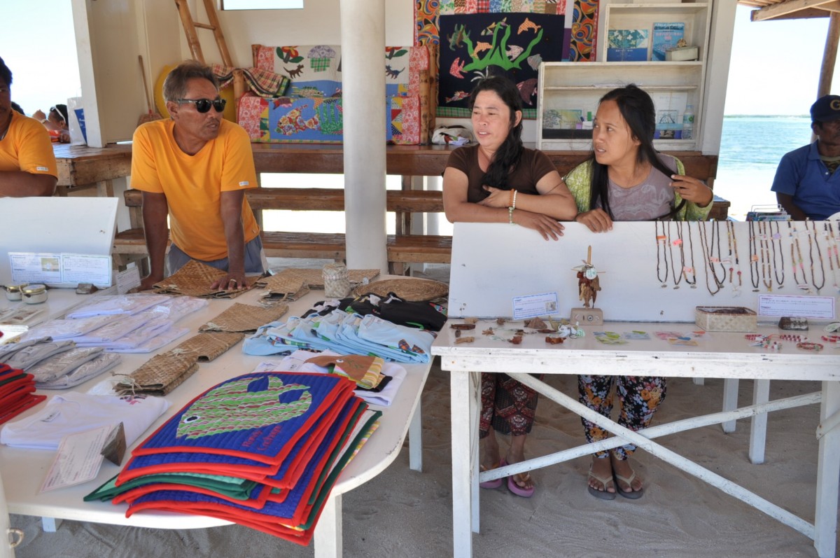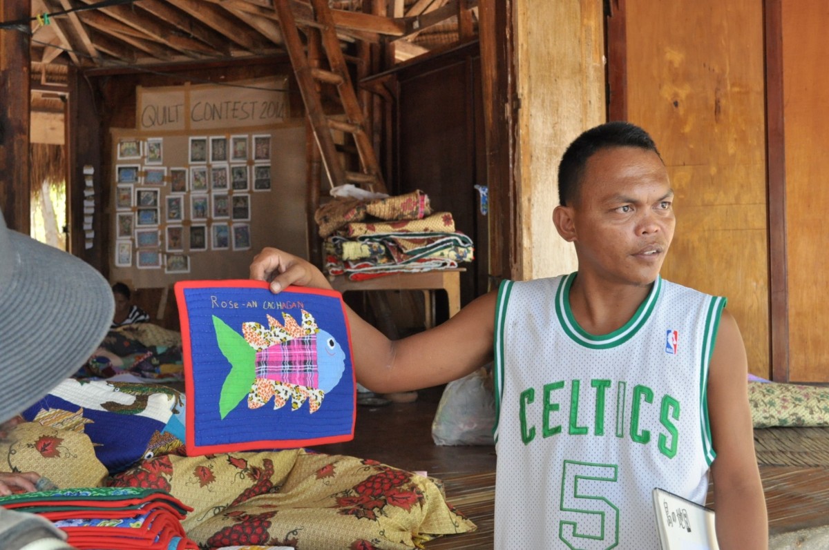 その後、村役場などをめぐり、ポントグビーチの前のお土産屋さんに。ここで子どもたちが作ったキルトや村人が作った民芸品が買えます。