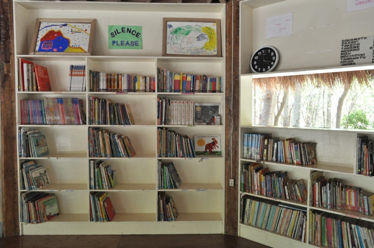 こちらは図書館。日本の本も並んでいて、子どもたちは読書していました。ワンコはひたすらついてきます。