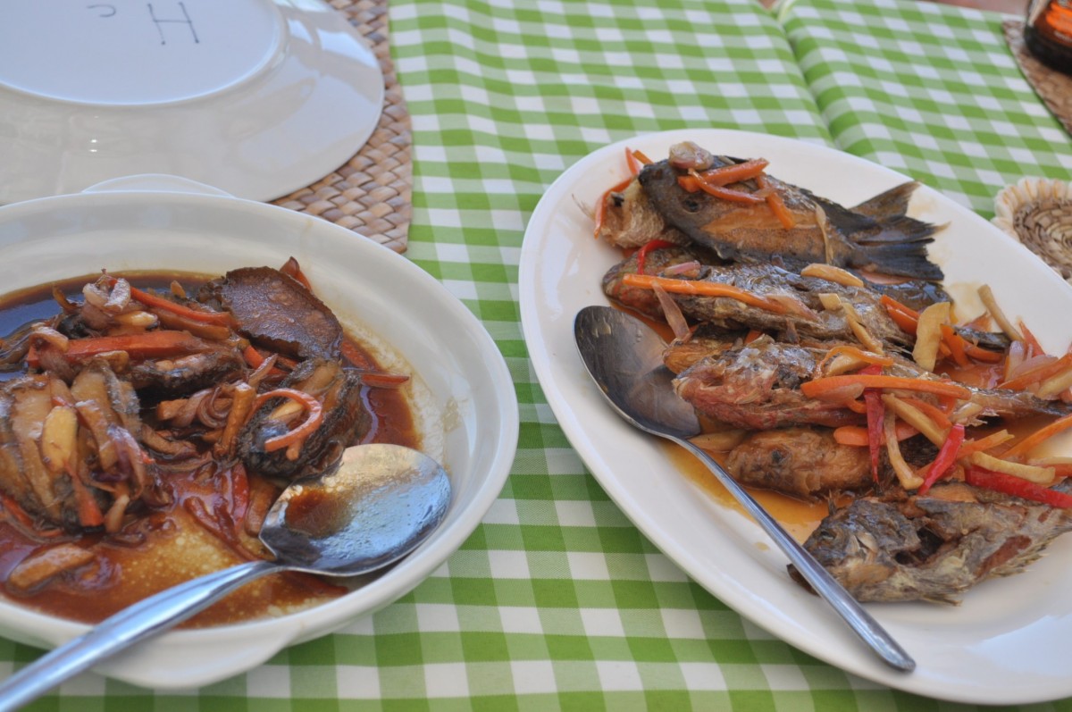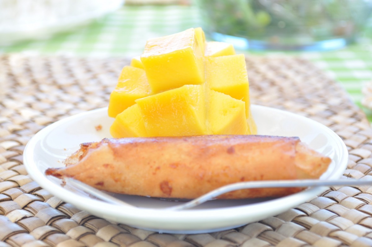 デザートは全員同じものが出ました。フィリピンのおいしいマンゴーに、手前はアツアツのバナナの砂糖付けの春巻き揚げ。これめちゃくちゃおいしい~~!
