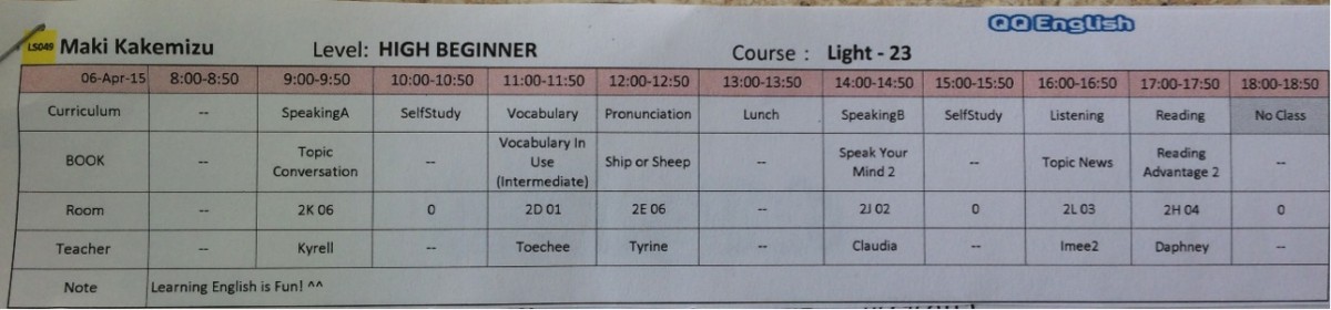 昨日受けたレベルチェックの結果が出ました!High Beginnerレベルです。特にリーディングが私のウィークポイントで、簡単なセンテンスは分かるけど、単語がわからないところが多いとのことでした。そして私の1週間の授業スケジュールが決定しました。ライトコースなので途中空き時間もあり、その時間はその前の授業の復習に充てることにしました。