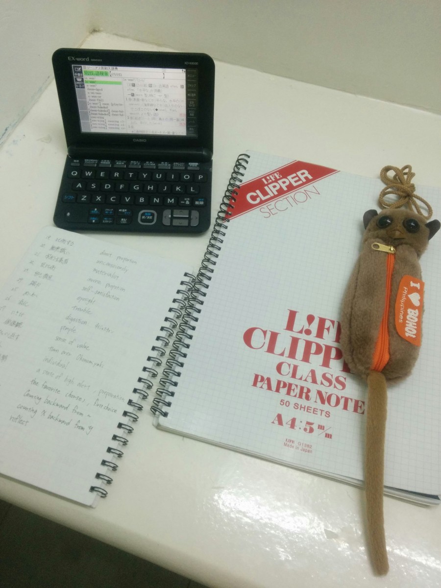 すべての授業中に日本語では出てくるのに、英語でなんて言えば分からない単語が出てきた時、日本語をノートの左側にメモします。その場で調べる時間がある時は電子辞書を使ってすぐに調べ、調べる時間がない時は自習室で授業が終わってから調べます。←授業後は疲れ果ててすぐに居眠りをしてしまうからあまりおすすめしないww