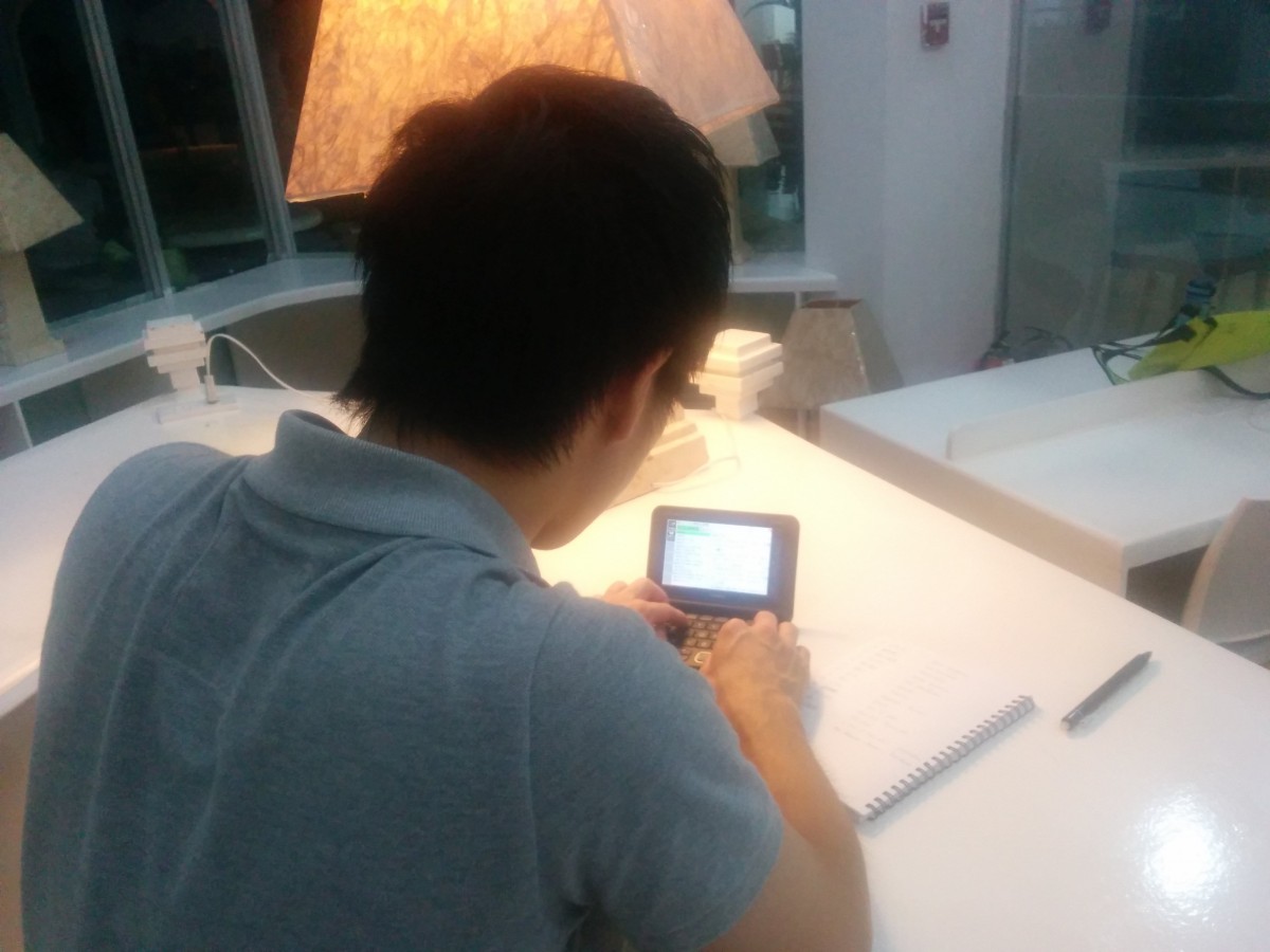 いつも私は写真のようにこの三種の神器を配置します。大きなノートは授業中のメモに使います。ポイントはこの小さなノートと電子辞書!!
