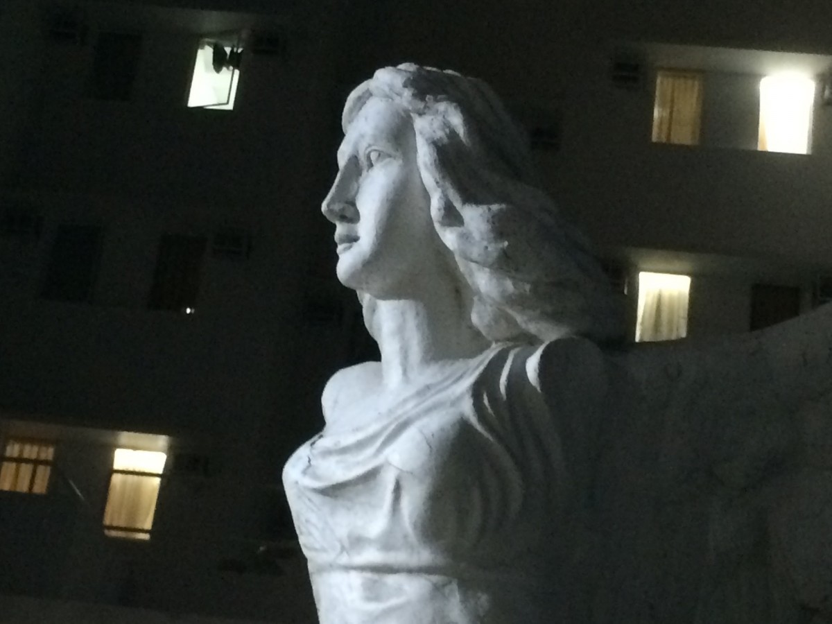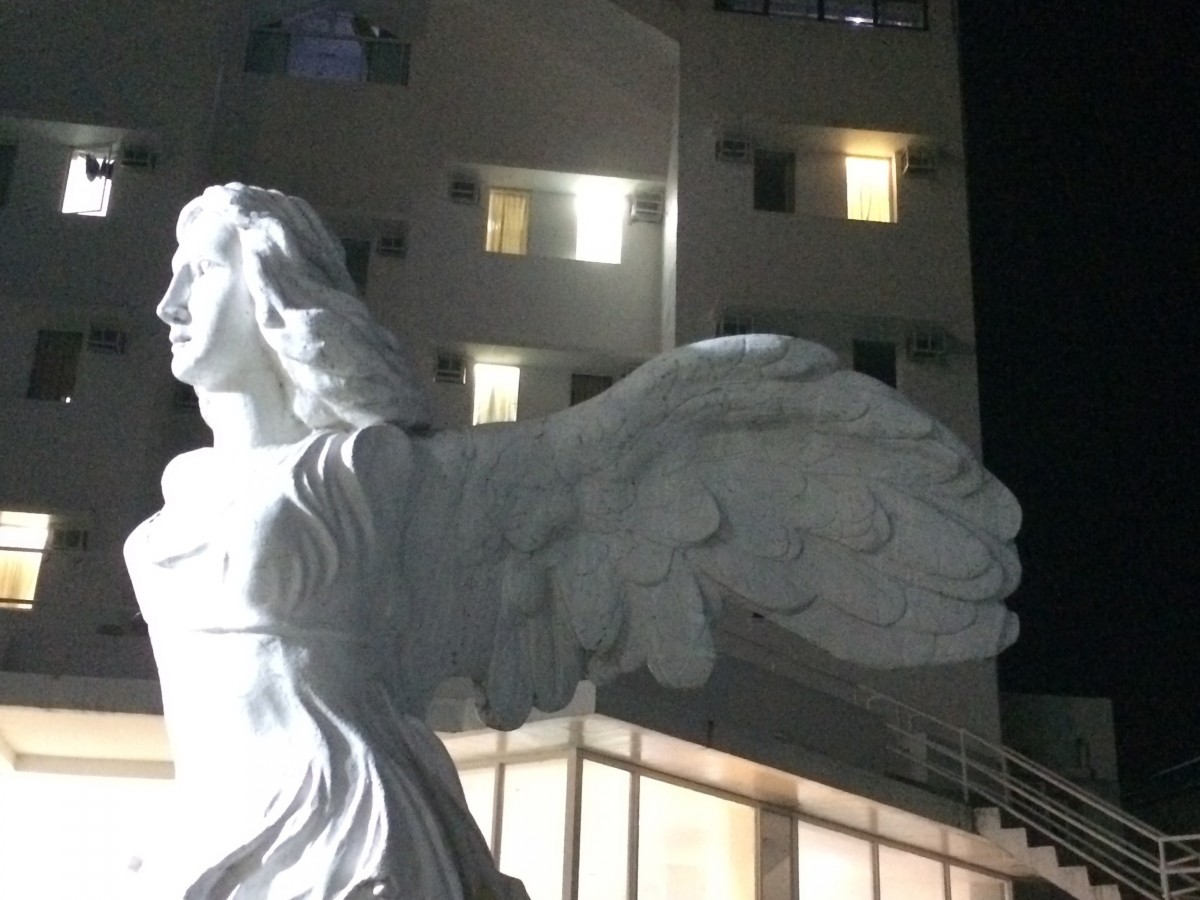 サモトラケのニケに顔がついた…石像がすぐ横のプールにあるんです。