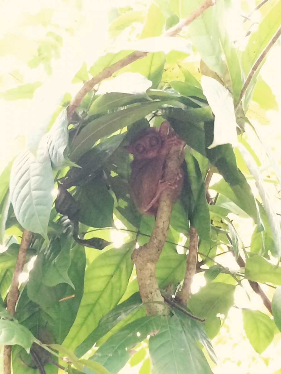 食事のあとはお待ちかねのターシャを見に行きました。ターシャとは小さなサルのことです。大きな目と長い尻尾が特徴です! どの先生も“It’s my cousin.”と冗談を言うくらい人気な動物です。なかなか上手く写真が撮れなかったのですが、現地のスタッフさんが撮ってくださいました。