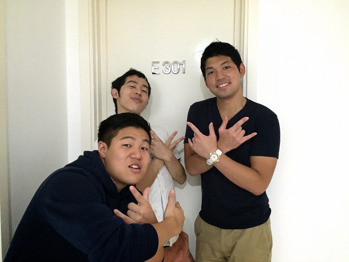 三人部屋のルームメイト、りょうすけとりんと記念撮影