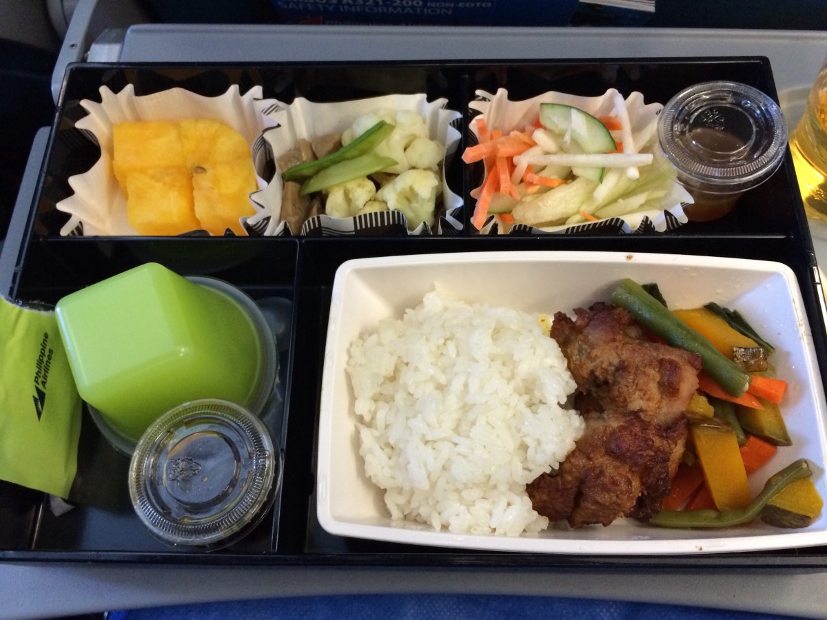 フィリピンエアの機内食は、わたしはジャパニーズチキンをチョイスしました!!(●´ڡ`●) デザートは黄色のスイカでした! 美味しかった!
