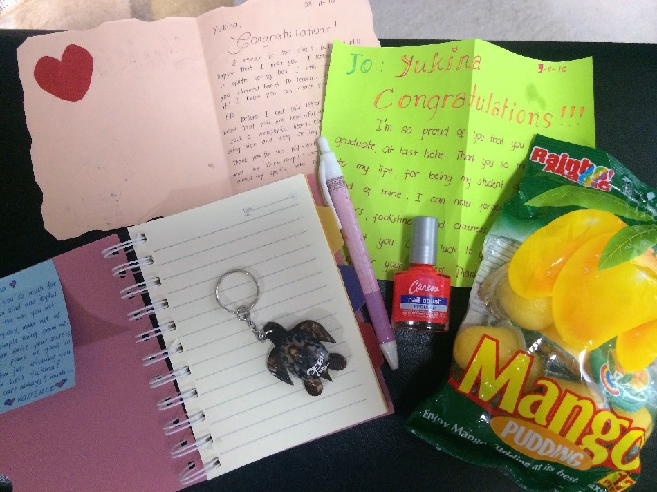 ついにこの日が来てしまいました。授業最終日です。今日が卒業式という実感がまったくありません。これからもずっと、素敵な先生方や友人達と笑っていられると信じたいです。授業に行くたびに、先生方が手紙やプレゼントを用意していてくれました。