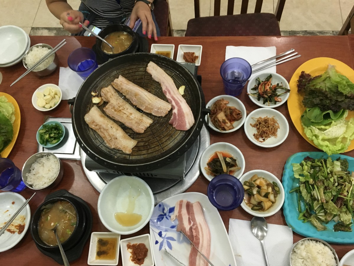 今日は授業が終わった後、近くの韓国料理屋さんにサムギョプサルを食べに行きました。ここのサムギョプサルは食べ放題で、価格は300ペソ、日本円で800円と、このボリュームにも拘らず、いつも通りにとても安く食べることができました(笑)。