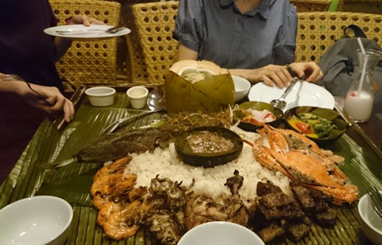 再びSMモールへと戻り夕食です。シーフードレストランに入りました。カニやエビ、イカ、肉、スープなどがご飯の上に盛り付けられています。 それにしてもすごい量ですね(汗)。 みんなでシェアして食べたのに完食できなかった(涙)。