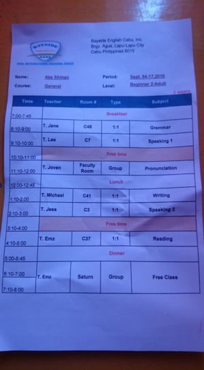 レベルチェックテストの結果はBeginner2という結果に。時間割を見ると、グラマー、スピーキング、発音、ライティング、リーディングの授業がバランスよく組み合わさっています。