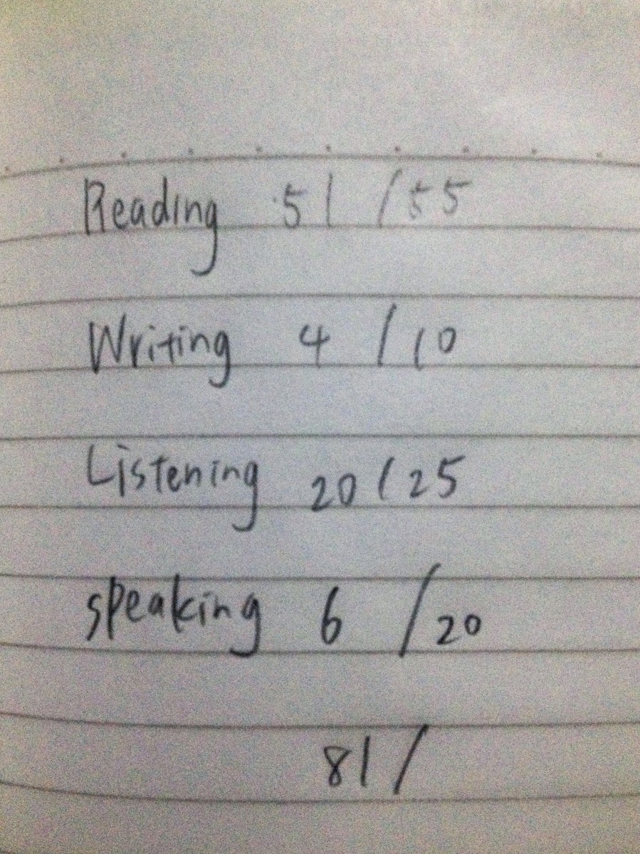 レベルチェックの結果がその日中に出ました。ライティングとスピーキングがすごく悪くて自分でもびっくりしました。この2週間で少しでも改善できるよう授業に専念しようと思います。
