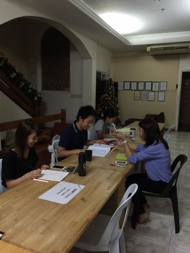 その後マンツーマンレッスンを受けた後、夕食の後はナイトクラスのみグループレッスンで複数の生徒と一緒に受講しています。とはいえ、私のいる今の期間は生徒の数は多くても6人程度なので分からないことは随時何でも質問できるような環境です。