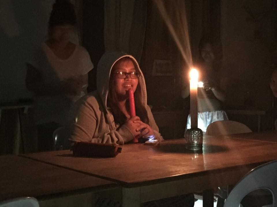 午後10時頃、授業も終わっていたので、リビングでくつろいでいたのですが、学校のある狭いエリアだけが急に停電になってしまいました。電線工事のせいだったのですが、そこから約1時間ほど工事が終わるまで電気を使うことができませんでした。
