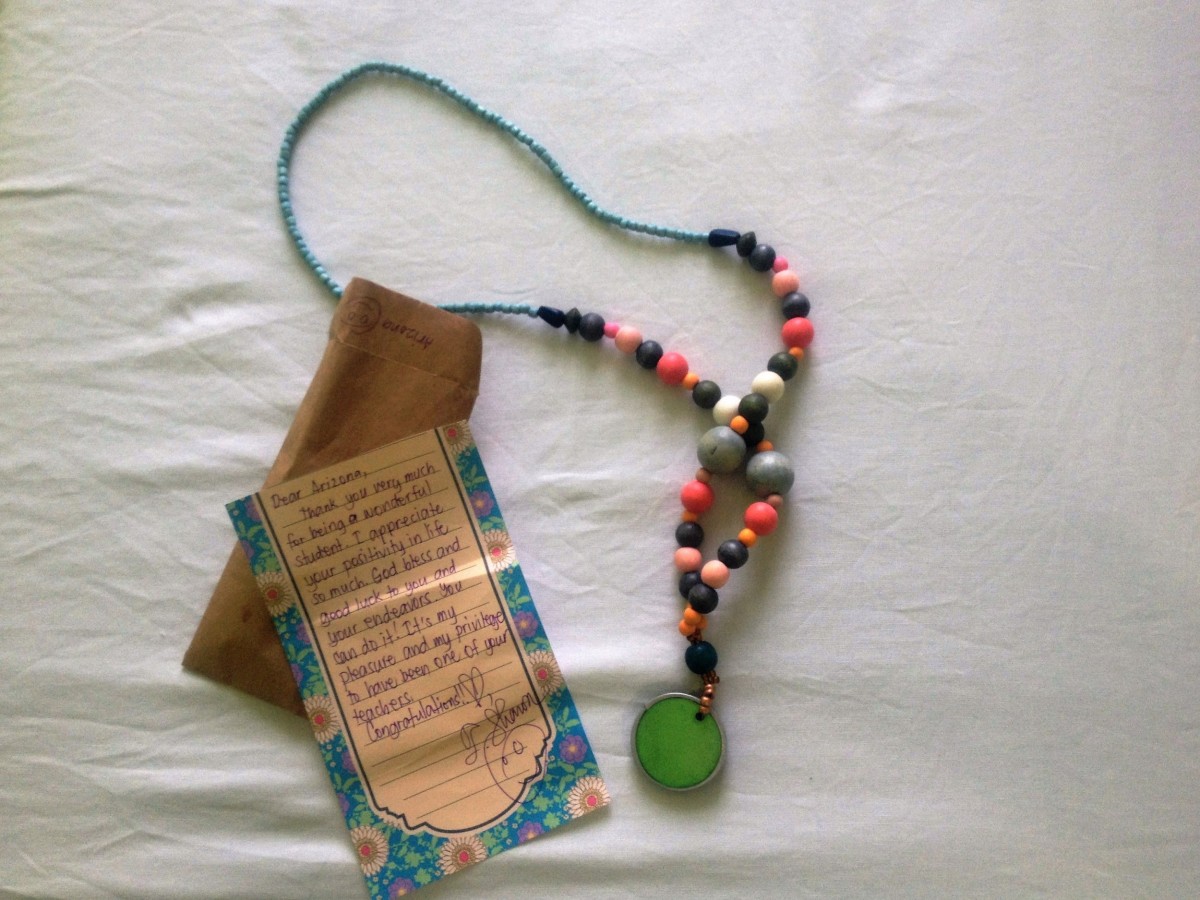 昨日、ある先生から頂いたプレゼントを開けてみました。中には、素敵なネックレスと手紙が入っていました。2週間という短い間でしたが、先生とはすごく仲良くなれました。それを実感できて嬉しかったです。