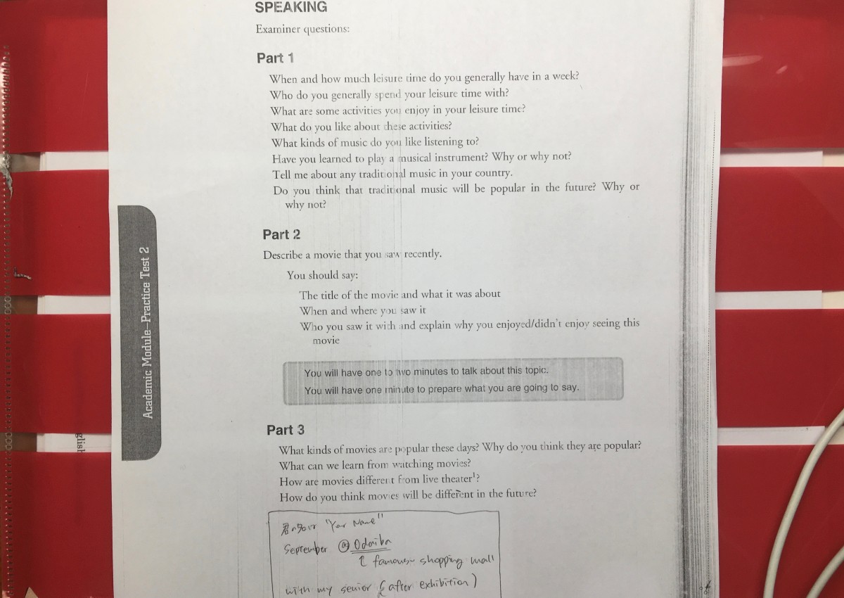 また、今日のIELTSの授業ではスピーキングの試験を行い、試験中に自分が話している様子を録音して聞いてみました。自分が思っていたよりも沈黙が長く、スムーズに話せていなかったので驚きました。